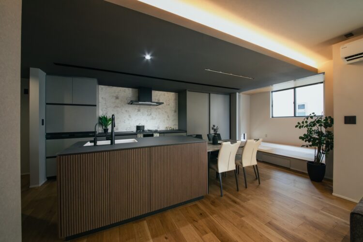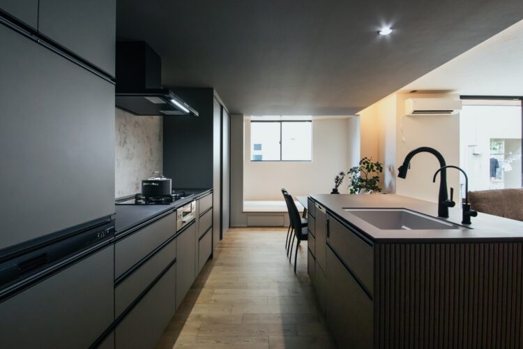 グレー系の色で仕上げたキッチン空間に「リブ化粧材」で仕上げたキッチンはとても印象的で、オーダーキッチンならではのオリジナル性を感じます。