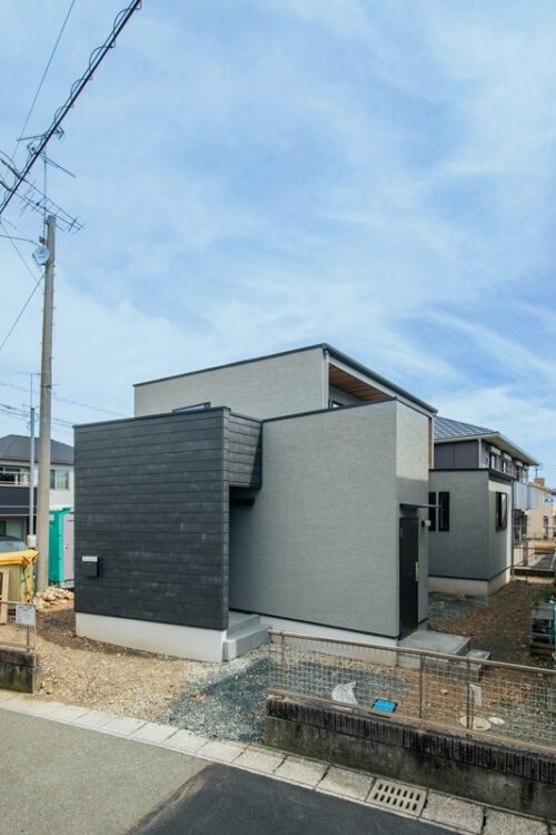 グレーの塗り壁とセメント素材の外壁材で仕上げた印象壁が上手に調和したモダンな外観のご邸宅。