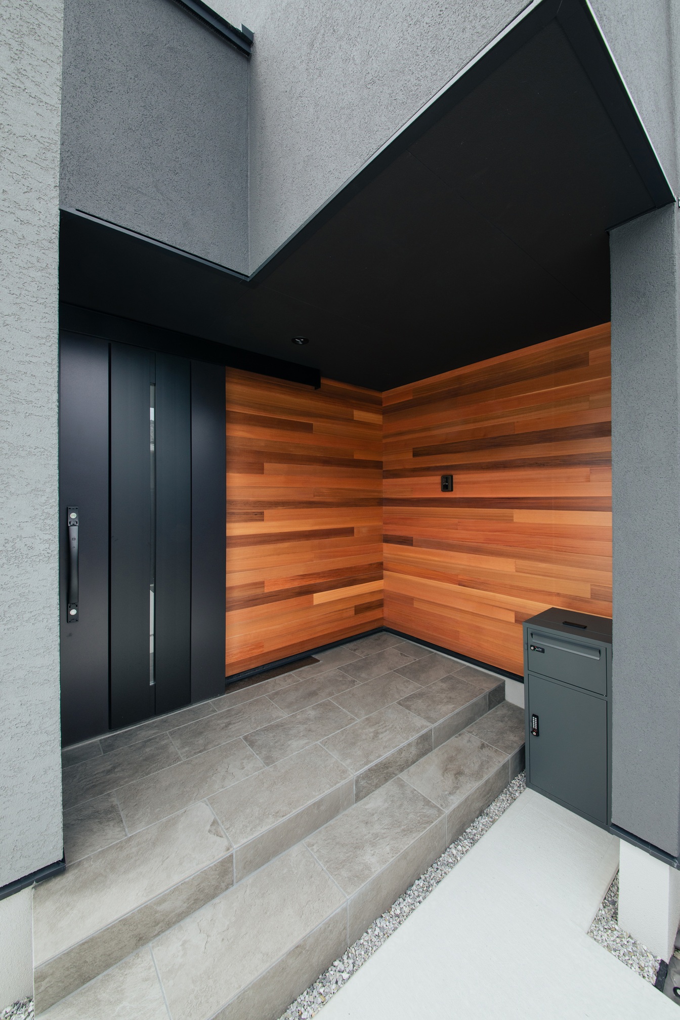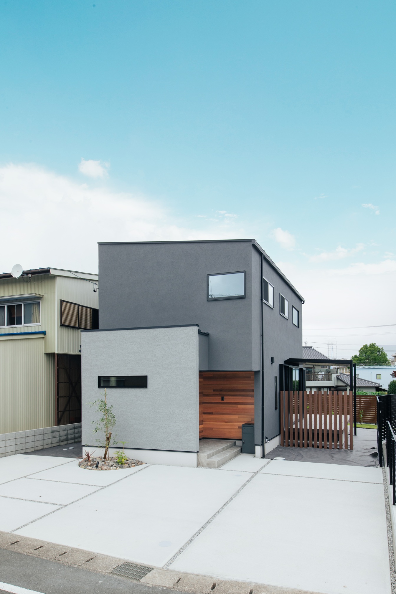 グレーの塗り壁とレッドシダーのアクセントが印象的な外観。