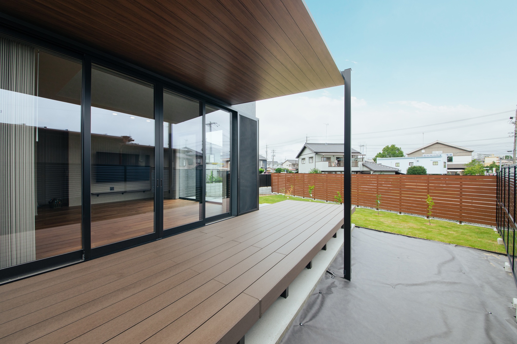 リビングには大きな窓を設け、ウッドデッキやタイルデッキを経て庭とつながるプランニングをし、室内外でくつろぎとアクティブを満喫できるプランとなりました。