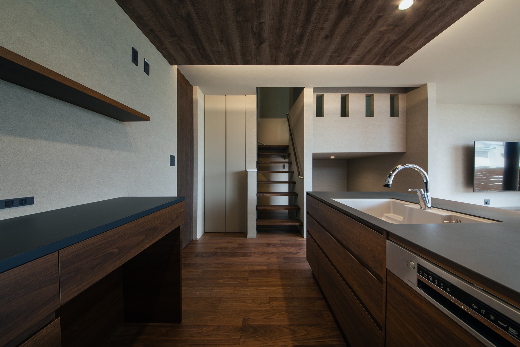 オーダーキッチンなど造作家具もこの色調に合わせ、濃い木目柄を採用し部屋全体で統一感を持たせています。