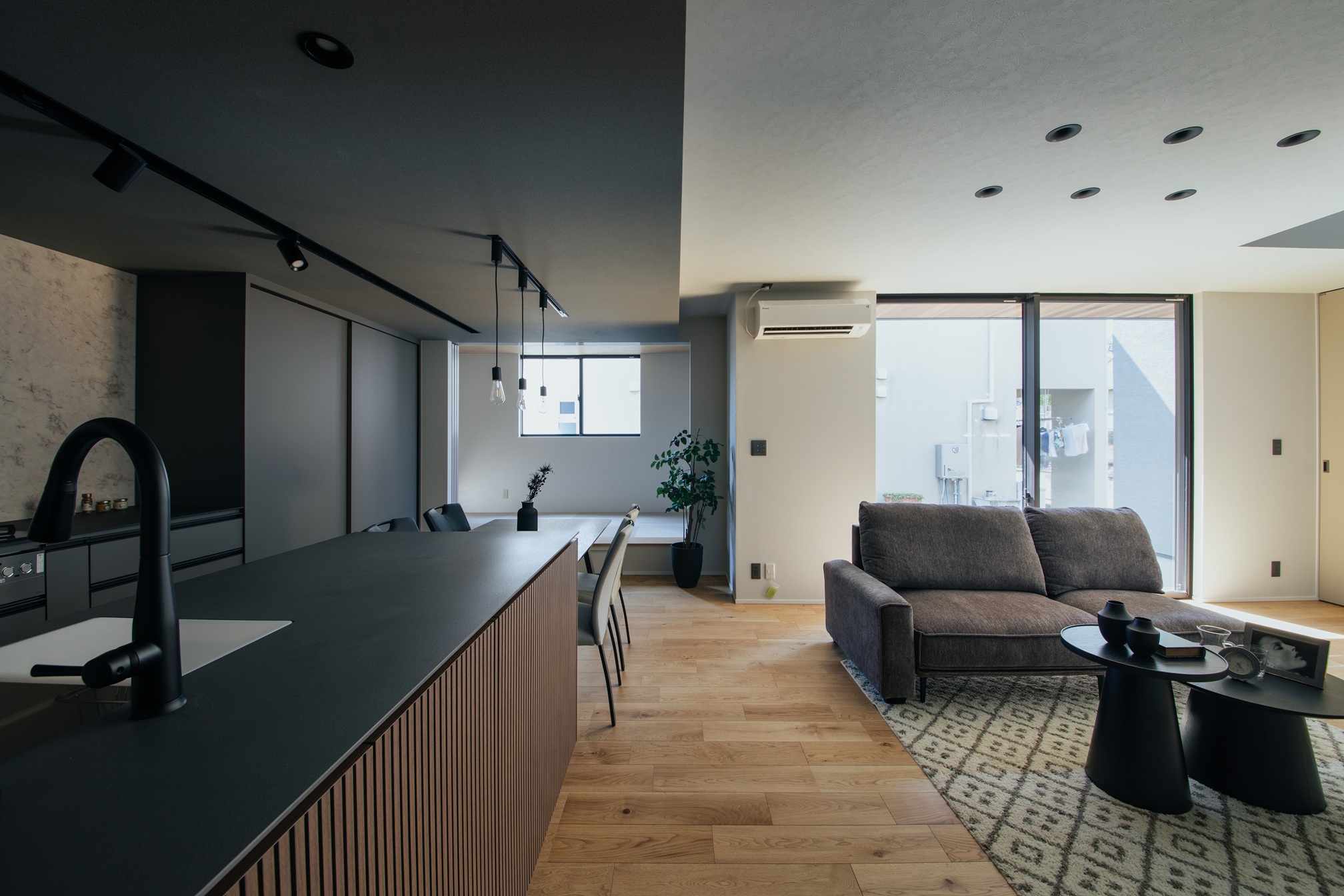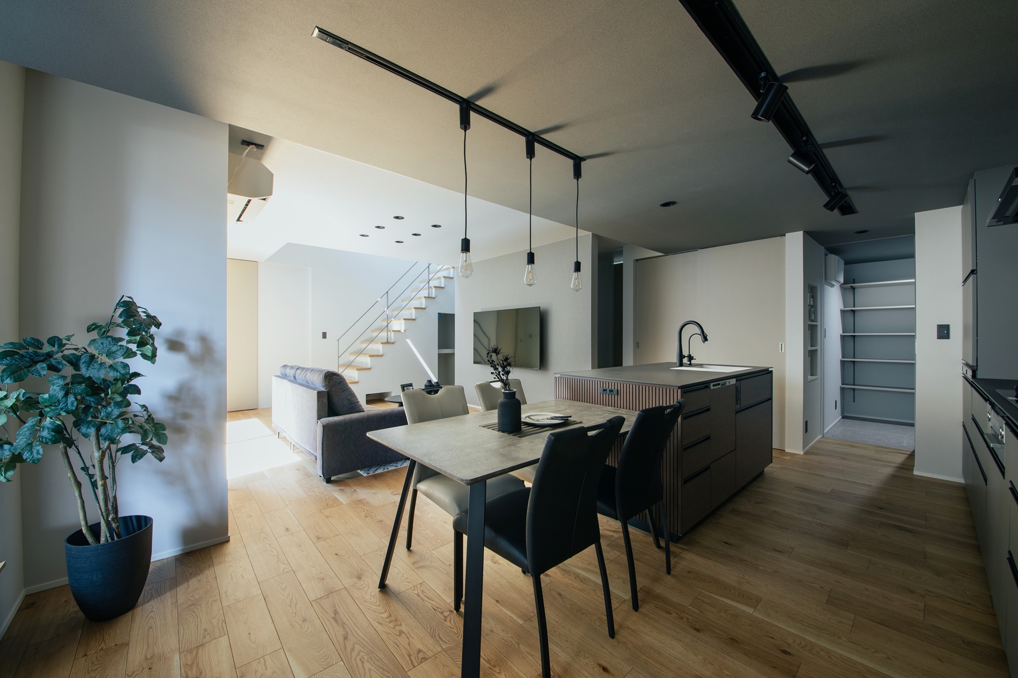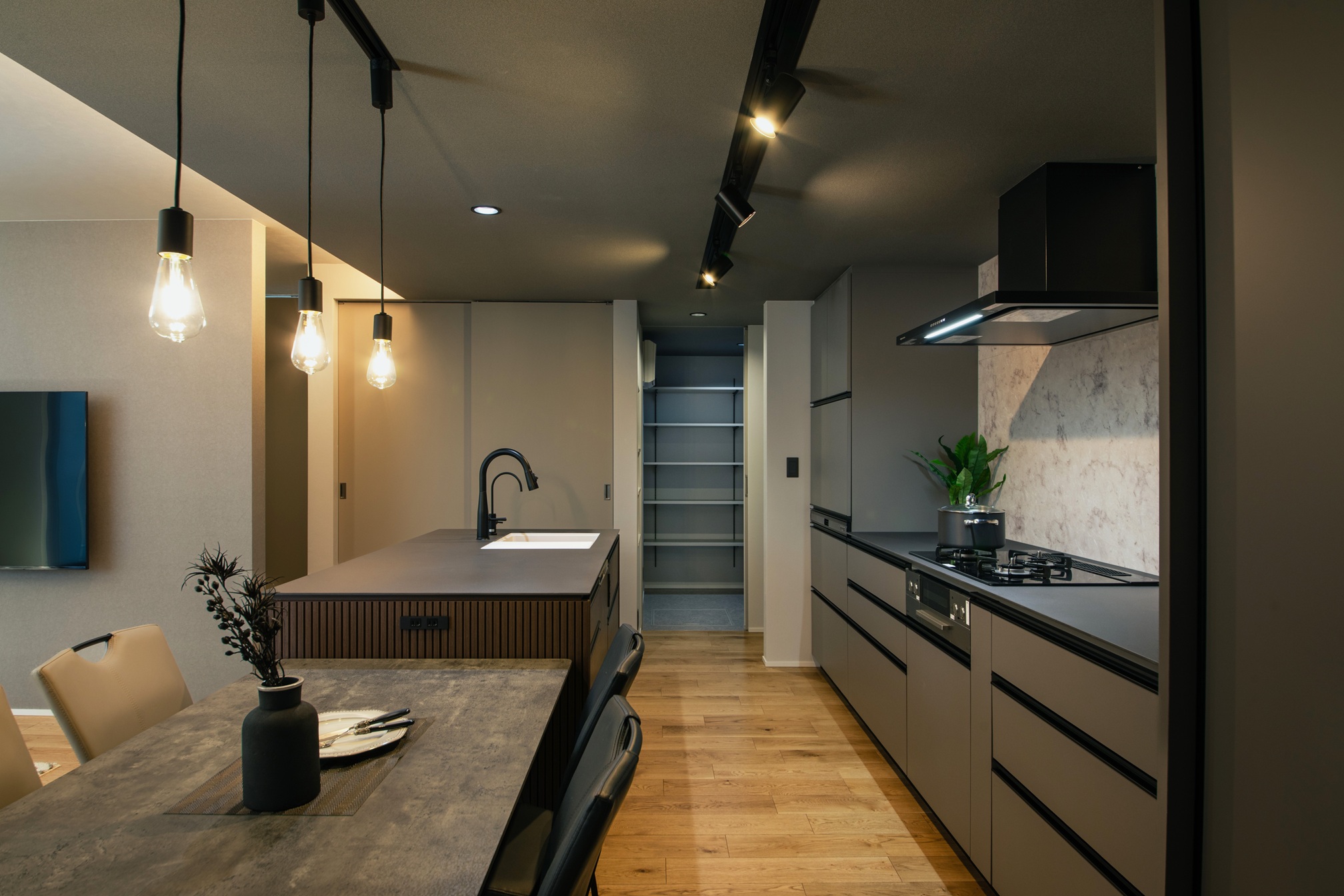 キッチンの面材にはリブ材を採用し、陰影のある表情が空間に奥行きを与えています。グレーやブラックでまとめられた落ち着いたLDKの中においても、過度に主張することなく、上品さと洗練を感じさせる佇まいが印象的です。オーダーならではの素材選びと設えが、日常の風景をワンランク上の空間へと引き上げています。