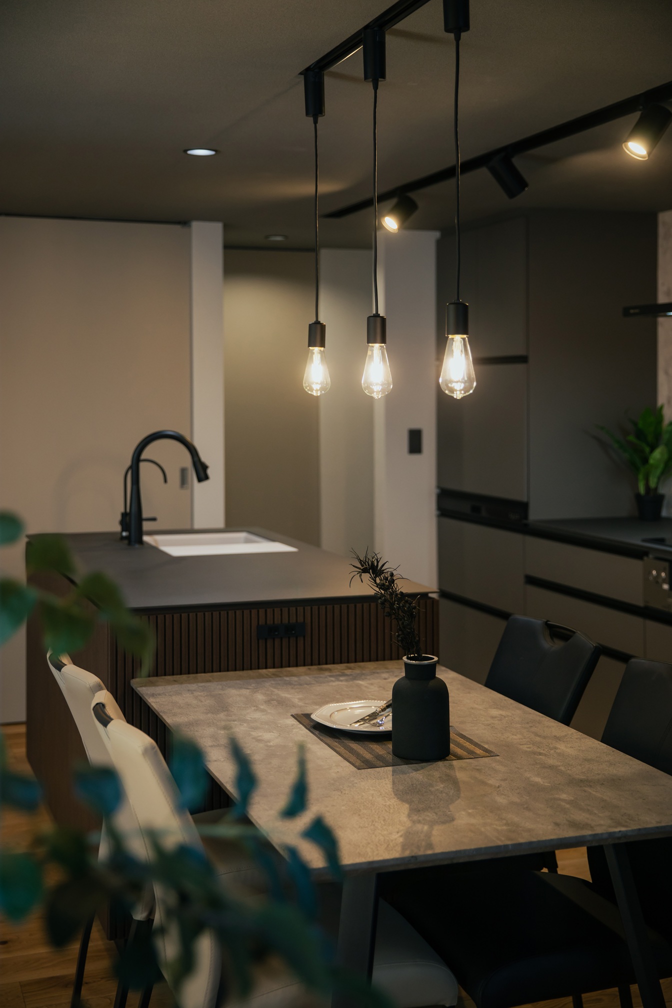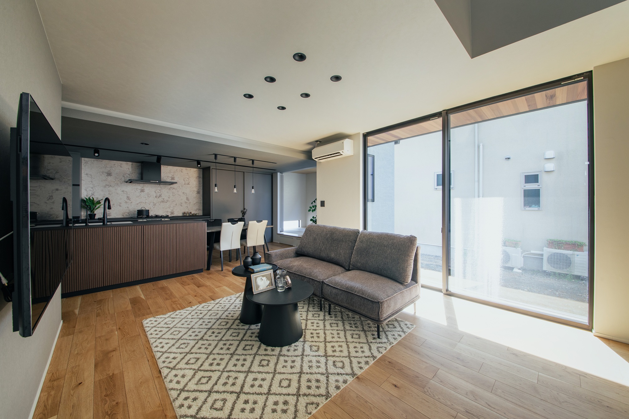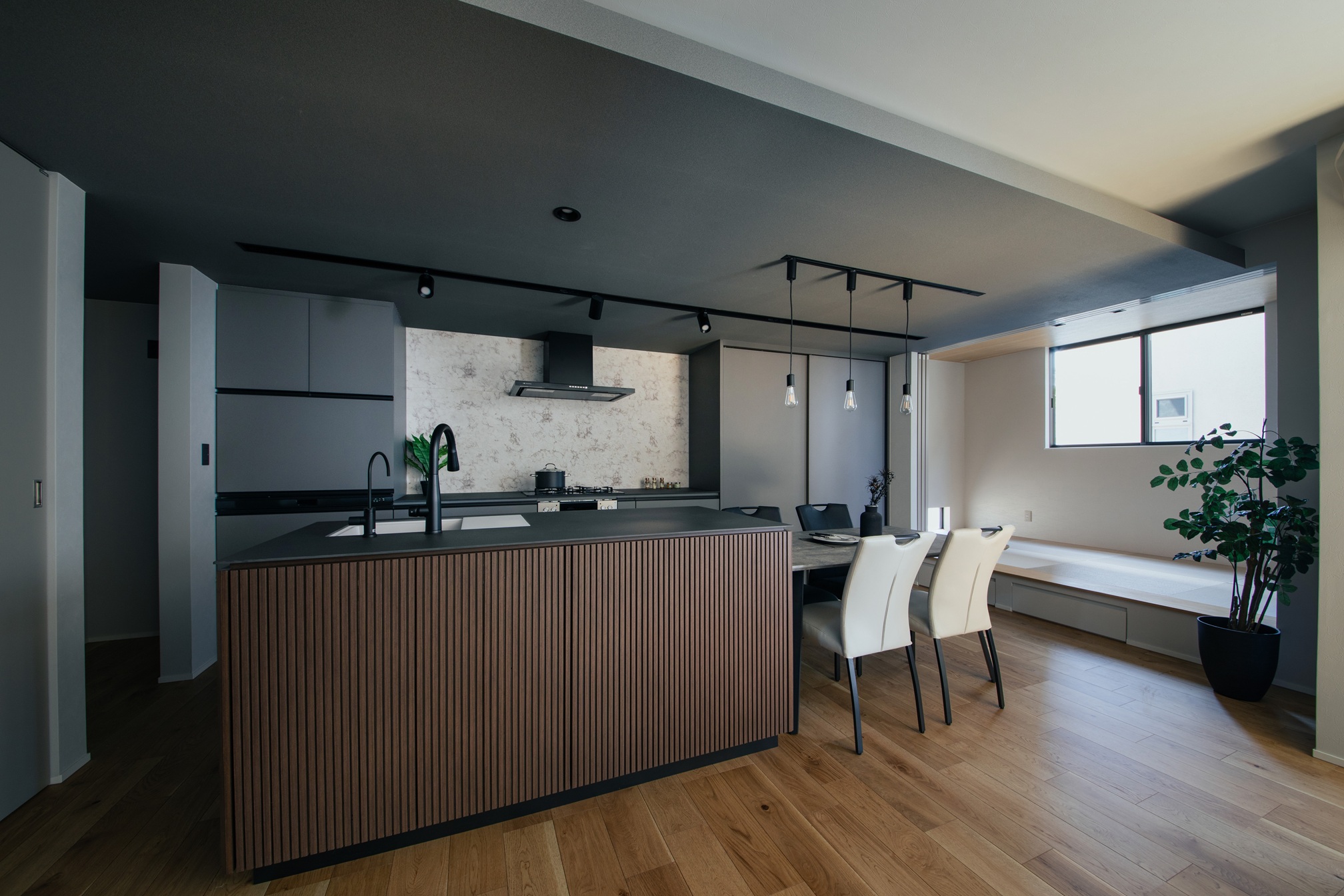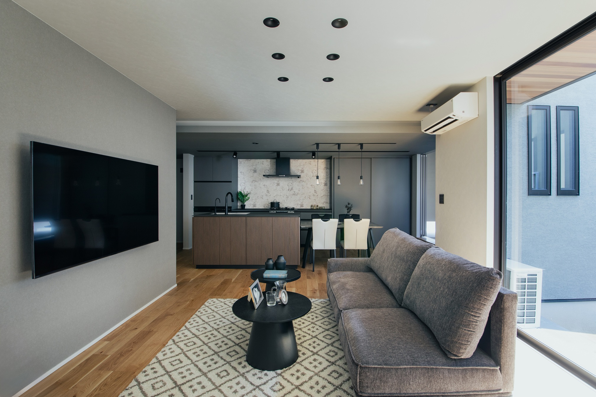 キッチンの面材にはリブ材を採用し、陰影のある表情が空間に奥行きを与えています。グレーやブラックでまとめられた落ち着いたLDKの中においても、過度に主張することなく、上品さと洗練を感じさせる佇まいが印象的です。オーダーならではの素材選びと設えが、日常の風景をワンランク上の空間へと引き上げています。